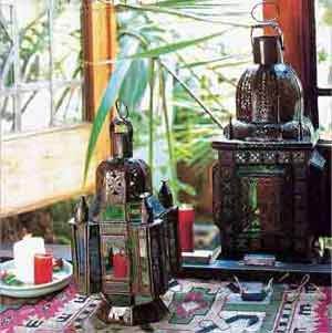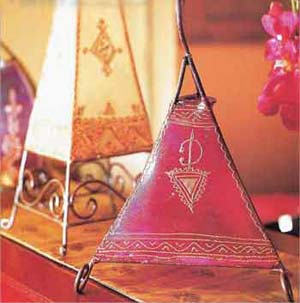 用敲打的方式將洋鐵或其他金屬制成臺燈的支架,然后繃上用天然植物顏料染色處理過的牛皮等皮革制作的彩色手繪燈罩,放在臥室里就將夢幻般的摩洛哥氛圍,以幻想般的手法表現(xiàn)出來,令空間充滿異國情調(diào)。