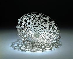 Designmai上有一些不俗的亮點(diǎn),如Geoffrey Mann的 “趨光(Attracted to Light)” 燈罩。它可以依靠一個(gè)光源追蹤一只蛾子的不規(guī)則飛行路線。設(shè)計(jì)者通過電影技術(shù)捕捉到昆蟲的螺旋型軌道并依靠快速原型制作技術(shù)制造出實(shí)物。