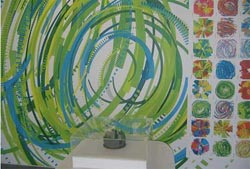 另外整個(gè)展覽是白色的,大部份設(shè)計(jì)及墻壁都是白色。Marius Watz在一片空白上噴繪出華麗的色彩。他的“照明B”(Illuminating B)模型,是100個(gè)高辨識(shí)率矢量圖像的序列。這項(xiàng)設(shè)計(jì)的軟件版本在二月被用于制作Club Transmediale 07的視覺效果。