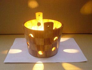 又有小木桶,桶底安裝燈泡,桶壁切出大小不一、分部不均的小孔,放射出美麗神秘的光線。放這樣一盞燈,得一番愜意舒服滋味。