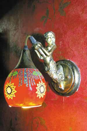 暗影浮動的墻面,有一個美人魚精靈手捧五彩古燈,倒垂下來的燈罩仿如花朵一般,經(jīng)典的花紋是否講述一個古老的故事?仰望過去,光在這五彩燈罩下暗自流淌,不停不息。
