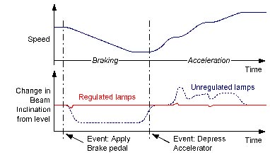 前大燈自動校平系統(tǒng)的工作原理是在車輛傾斜的情況下仍保證燈光與路面呈水平狀態(tài)(見下圖)。車輛處于停止狀態(tài)時可能會由于某些原因而傾斜,例如有乘客上車,或裝行李,甚至是給油箱加油。同樣的,當車輛處于行進狀態(tài)時,也會由于剎車或加速而導致車輛傾斜。在這兩種情況下,車前大燈都必須保持與公路水平的狀態(tài)。前大燈自動校平系統(tǒng)根據(jù)傳感器的一系列數(shù)據(jù),尤其是從前后車軸傳來的懸架壓縮數(shù)據(jù)調(diào)節(jié)各車燈的角度。