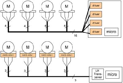 上述兩種型號(AMIS-30621和AMIS-30623)器件的特色在于以LIN總線為接口。相較于將驅(qū)動器置于遠端的系統(tǒng),這一方法節(jié)省了布線成本,并且擁有更好的電磁兼容性能,這一優(yōu)勢是在汽車應用中遇到困難時解決問題的關(guān)鍵。其余兩種改進型(AMIS-30622和AMIS-30624)擁有I2C的串行接口,能夠作為單一印制電路板上與微控制器相鄰的外圍器件。