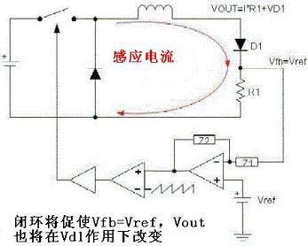 圖1中,R1采樣流經(jīng)D1 的電流。其結(jié)果電壓將在脈寬調(diào)制控制器中與一個(gè)基準(zhǔn)電壓進(jìn)行比較,以確保開(kāi)關(guān)在每一時(shí)鐘周期的確定百分比的時(shí)間內(nèi)閉合。在開(kāi)關(guān)閉合期間,有足夠的能量被轉(zhuǎn)換至輸出,以產(chǎn)生所需的電流,該電流流經(jīng)R1。如果過(guò)多或過(guò)少的能量被轉(zhuǎn)換,R1兩端的電壓將增加或減少,從而改變開(kāi)關(guān)閉合的時(shí)間。上述轉(zhuǎn)換的結(jié)果是閉環(huán)系統(tǒng)維持了R1兩端的電壓值,使其等于基準(zhǔn)電壓,并為二極管D1輸送了恒定的電流,其電流值為: