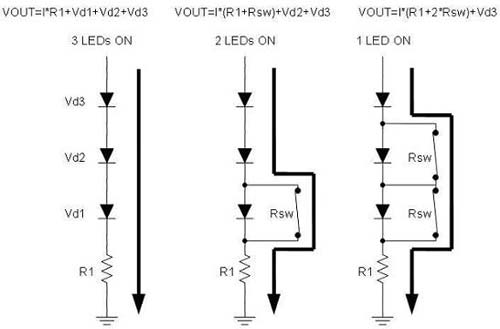 該替換方法將產(chǎn)生一致的電流,并將LED串行連接配置。對(duì)于亮度的控制可通過(guò)與每一LED并聯(lián)的場(chǎng)效應(yīng)管(FET)開(kāi)關(guān)實(shí)現(xiàn)。當(dāng)FET開(kāi)關(guān)打開(kāi),其共通的電流將分流繞過(guò)LED并使其關(guān)閉。其控制裝置(control mechanism)可用于調(diào)整LED,以控制每一時(shí)鐘周期內(nèi)確定百分比的導(dǎo)通及關(guān)閉。該方法如圖2所示,圖中串行的LED具有相同的電流,并通過(guò)各自獨(dú)立的并行FET開(kāi)關(guān)實(shí)現(xiàn)調(diào)節(jié)。采用該方法的另一實(shí)現(xiàn)方式如圖3的模塊化構(gòu)成所示。