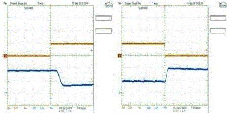 由于此為恒定電流系統(tǒng),在脈寬調(diào)制的輸出端無(wú)需大的輸出能力。從而不僅節(jié)省了元件成本,同時(shí)還有助于系統(tǒng)更快的響應(yīng)輸出電壓的改變。此類(lèi)改變的電壓上升源于FET開(kāi)關(guān)的導(dǎo)通,而電壓下降的改變則源于LED下跌至某一更小的值(因FET的導(dǎo)通阻抗(Rdson)而導(dǎo)致)。下方的圖5舉例說(shuō)明了當(dāng)某通道導(dǎo)通或關(guān)閉時(shí)的快速響應(yīng)情況。如圖所示,當(dāng)脈寬調(diào)制控制器的控制環(huán)路無(wú)過(guò)沖或不穩(wěn)定時(shí),轉(zhuǎn)換是平滑的。