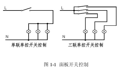 蹺板開關(guān)設(shè)置于門口,對(duì)于面積較大的房間燈具較多時(shí),采用雙聯(lián)、三聯(lián)、四聯(lián)開關(guān)或多個(gè)開關(guān),其原理接線圖見圖1-1。