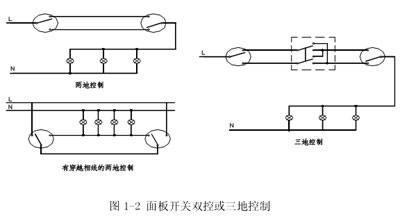 對(duì)于樓道和樓梯照明,多采用雙控方式(有的長(zhǎng)樓道采用三地控制),在樓道和樓梯入口安裝雙控蹺板開關(guān),其特點(diǎn)是在任意入口處都可以開閉照明裝置。其原理接線圖見圖1-2。