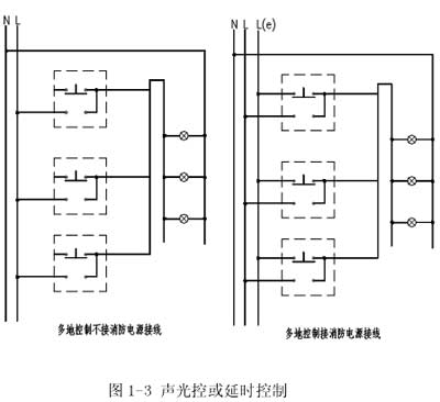 2. 定時(shí)開關(guān)或聲光控開關(guān)控制住宅樓、公寓樓樓梯間多采用定時(shí)開關(guān)或聲光控開關(guān)控制,其原理接線圖見圖1-3。