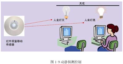 在一定場(chǎng)所或整個(gè)樓宇,根據(jù)人員走動(dòng)情況進(jìn)行開關(guān)燈的一種方式。見圖1-9。