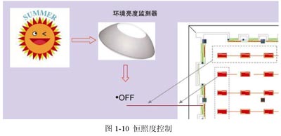 根據(jù)探頭探測(cè)到的照度來控制照明場(chǎng)所內(nèi)相關(guān)燈具的開啟或關(guān)閉,保持場(chǎng)所的照度恒定。見圖1-10。