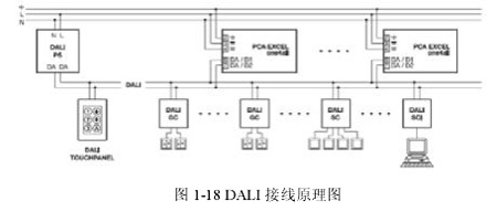安裝 DALI 接口有 2 條主電源線,二條控制線,對(duì)線材無特殊要求,安裝時(shí)也無極性要求,只要求主電源線與控制線隔離開,控制線無需屏蔽,要注意的是當(dāng)控制線上電流在 250mA,線長(zhǎng) 300 米時(shí)壓降不超過 2V。控制線和電源線可并行,無需另外敷線。設(shè)計(jì)緊湊的控制組件無需專門的控制柜,因此安裝簡(jiǎn)便且經(jīng)濟(jì)。接線原理見圖1-18。