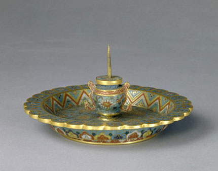 燭臺銅胎鎏金,圓盤形,菊瓣式邊,盤心置一寶瓶式鎏金長阡。盤內(nèi)壁掐絲琺瑯天藍地上壓纏枝菊花紋。盤外壁及底藍地上飾多色釉勾云紋,盤底中心綠地長方框內(nèi)朱紅楷書“大明萬歷年造”六字款。