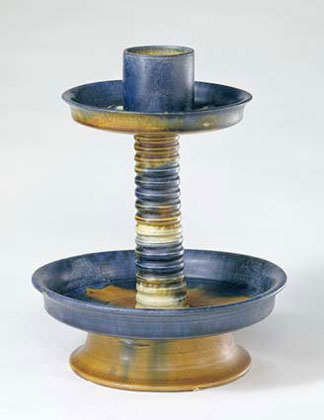 燭臺分上下兩部分,上盤小,下盤大,中間承以起弦圓柱,圈足外撇,上盤中心立杯形燭座;通體施藍、黃、綠、白彩釉,底素胎無釉。