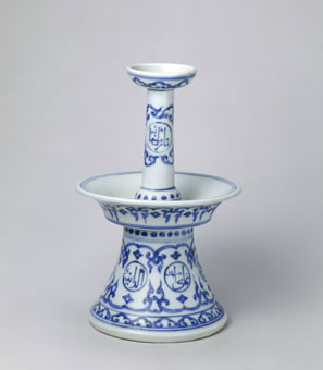 燭臺分上下兩層,上層托盤小而淺,下承以細長的支柱,下層托盤為敞口,折底,盤下承喇叭形外撇高足。小托盤外壁繪如意云頭紋一周,大托盤外壁飾雙勾花枝紋,間以菱形紋飾。支柱及足壁上中央紋飾為圓形開光內(nèi)寫阿拉伯文,開光之外圍以雙勾花紋及菱形紋,再外之上下邊緣分別飾以連珠紋及如意云紋。盤底青花雙圈內(nèi)雙行楷書“大明正德年制”六字款。