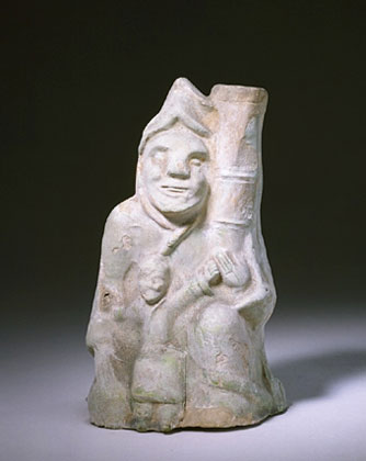 這類執(zhí)燈陶俑目前發(fā)現(xiàn)數(shù)量不少,一般為兩種樣式,除上述樣式外,另一種則是俑將燈頂在頭上。對比西安市北周史君墓石槨上四臂神腳踏小人的圖像,推測此俑的形象可能與當時在西域廣大地區(qū)流行的瑣羅亞斯德教有關(guān),這是值得進一步探討的問題。(撰稿人:胡國強)