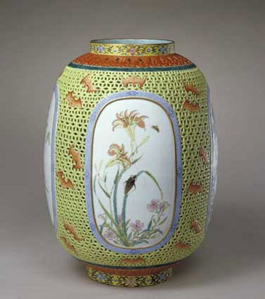 燈罩直口,長腹,圈足。形似燈籠,中空,口底相通。口、足上各繪黃地粉彩朵花紋一周,肩、脛均施抹紅鏤空變形蕉葉紋,腹部為鏤空綠地粉彩錢紋綴以紅蝠,四面各有一開光,開光內(nèi)繪白地粉彩四季花蝶草蟲紋。開光四周施藍地粉彩纏枝菊花紋一周。