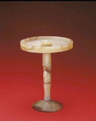戰(zhàn)國時期出現(xiàn)了百家爭鳴的新形勢,社會環(huán)境和人文氛圍較以前有了很大的改變,玉雕作品的風格也為之一新,新穎的造型和先進的工藝成為創(chuàng)作的主流,開創(chuàng)了玉雕史上新的藝術(shù)流派。本器的座、柱、盤分別由三塊玉雕成,嵌粘密實,紋飾精美,富有層次感,顯示出精湛的雕刻技術(shù)。造型設(shè)計獨具匠心,燈柱上部處理成三棱形,下部為圓柱形并收腰,于簡單流暢的造型中又顯露出豐富的變化。目前所知,此燈為孤品。(撰稿人:趙桂玲)