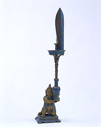 燈座造型為一胡人單腿跪于方座之上雙手托舉觀音瓶,瓶上置蠟釬,燈盤一側(cè)有蓮瓣形燈擋。通體以藍色琺瑯釉為地,瓶身及燈盤等處飾彩色纏枝蓮紋。胡人深目高鼻,胡須濃密,身穿罩甲,甲飾纏枝蓮及菊花紋,并于前身后背飾各色“壽”字,人物的頭、腿、足部均鍍金,面部表情豐富生動。此器釉色灰暗,砂眼較多,為清早期掐絲琺瑯作品的風格。燈座的胡人形象反映了中西文化的交流與融合。(撰稿人:陳麗華)