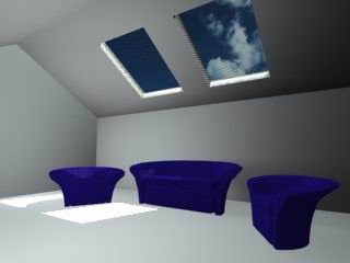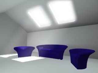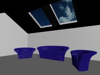 最后在三個沙發(fā)上各放一盞燈(用關(guān)聯(lián)的方法),亮度打低,我打在0.03,排除沙發(fā),顏色設(shè)定為沙發(fā)的藍(lán)色,這樣沙發(fā)的顏色影響就表現(xiàn)出來了,(這組等千萬別打高,否則就成月夜的陽光了)