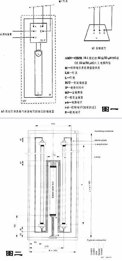 但是這又不具備可操作性,因?yàn)槠湟粸閻毫忧闆r的燈具是太嚴(yán)格了,實(shí)際測(cè)試中存在商用鎮(zhèn)流器在最差情形的燈具中不能通過(guò)某些試驗(yàn),而在實(shí)際燈具中能夠通過(guò);其二為即使鎮(zhèn)流器在惡劣情況的燈具內(nèi)試驗(yàn)通過(guò)了,仍遺留一個(gè)問(wèn)題就是鎮(zhèn)流器內(nèi)裝在實(shí)際的燈具中不符合標(biāo)準(zhǔn)時(shí)的責(zé)任問(wèn)題。為解決以上問(wèn)題,使測(cè)試結(jié)果有一致性,目前國(guó)際上采用CISPR30:2001《Test method on electromagnetic emissions from electronic ballasts for single-and dou-ble—capped fluorescent lamps》。主要涉及到單端和雙端熒光燈用電子鎮(zhèn)流器,如圖2所示。