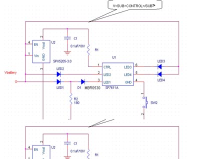 當(dāng)SW1和SW2閉合時,U1和U3均工作,主燈LED1~LED5點(diǎn)亮,此時通過LDO SPX5205提供3V電源來設(shè)置LED1的電流。