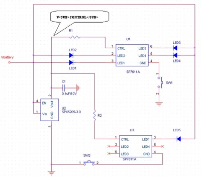 在圖2電路中,當(dāng)SW1關(guān)閉,SW2打開時,副LED燈工作,流過LED1的電流ILED=(Vbattery-Vf)/R2,其中D1被用來防止電流通過芯片流到地。此時芯片SP7611A沒有工作,由于流過LED1的電流較小,所以工作時間可大于30小時。