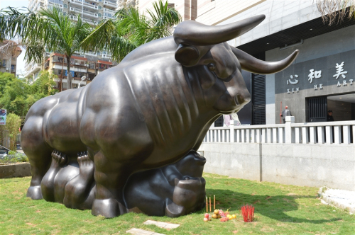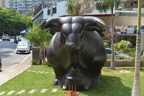 這是由廈門知名收藏家蔡銘超耗資百萬定制的一尊世上最大“牛壓熊”雕塑。這尊雕塑長6.1米,高3.4米,寬2.9米,重3噸多,采用銅材質(zhì)、鑄造工藝打造,造型是牛身下壓著一只熊。從雕塑外表看,牛和熊很容易讓人聯(lián)想起股市,而這正是制作者蔡銘超的意圖。他表示,這座雕塑寄托了廣大股民的希望:牛市永遠強勁,熊市無法抬頭。