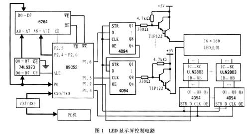 具體的LED顯示屏控制電路如圖1所示。整個電路由單片機89C52、點陣數(shù)據(jù)存儲器6264、列驅動電路ULN2803、行驅動電路 TIP122、移位寄存器4094及附屬電路組成。該電路所設計的電子屏可顯示10個漢字,需要40個8×8 LED點陣模塊,可組成16×160的矩形點陣。由于AT89C52僅有8k存儲空間,而顯示的內(nèi)容由PC機控制,因此不可能預先把需要顯示的內(nèi)容做成點陣存在單片機中,而只能由PC機即時地把所需顯示的點陣數(shù)據(jù)傳給單片機并存入緩沖區(qū)6264。