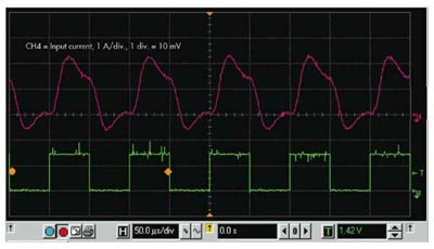 圖1:下面的線跡顯示PWM信號(hào)使LED電流從700mA降至350mA。上面的線跡顯示輸入電流紋波的峰-峰值接近3A。