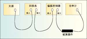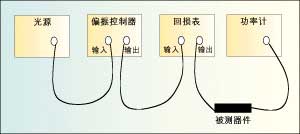 在圖一所示的測試系統(tǒng)中,測試光首先通過偏振控制器,然后經(jīng)過回波損耗儀,回波損耗儀的輸出端相當(dāng)于測試的光輸出口。這里需要強(qiáng)調(diào)一點,由于偏振控制器有1~2dB插入損耗,回波損耗儀約有5dB插入損耗,所以此時輸出光與直接光源輸出光相比要小6~7dB??梢杂脙筛鶈味颂€分別接在回?fù)p儀和功率計上,采用熔接方式做測試參考,同樣可采用熔接方法將被測器件接入光路以測試器件的插損、偏振相關(guān)損耗(PDL)和回波損耗(ORL)。