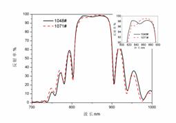 對于傳統(tǒng)紅黃光LED,這種厚度信息對DBR反射層信息的干擾也許可以忽略,但是對于RCLED影響卻相當大,以至于不能準確分析諧振腔的參數(shù)。一個實際RCLED結構中包含被稱為電流擴展層的厚層,我們根本無法確定光學凹陷的位置,如圖2,RCLED全結構的反射率曲線,兩個批次間隔20爐投片。
