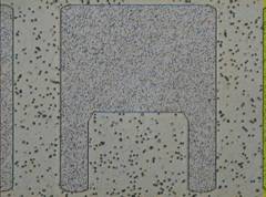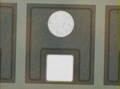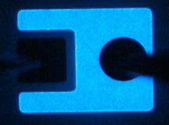 將經(jīng)過(guò)熱H3PO4腐蝕過(guò)的GaN材料制備成325um×375um的芯片,對(duì)其光電性能進(jìn)行測(cè)試。圖6與圖7是芯片在點(diǎn)亮前后的照片,從圖中可以看到,粗化后的GaN材料制成芯片后,其P電極及整個(gè)電流擴(kuò)展層表面較粗糙;芯片在5mA下點(diǎn)亮后,發(fā)現(xiàn)其電流可以擴(kuò)展均勻,并未產(chǎn)生局部發(fā)光現(xiàn)象。