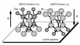 圖3給出了已刻蝕MESA平臺(tái)圖形的GaN材料,在210℃熱H3PO4中腐蝕5min后的表面形貌,從圖中我們可以看到,平臺(tái)上的P型GaN表面的凹坑較小而且濃密,而平臺(tái)下面的N型GaN表面的凹坑較大且較稀疏,導(dǎo)致該差異的主要原因取決于GaN材料的極性,圖4給出了GaN材料的極性結(jié)構(gòu)圖,通常Ga極性的GaN其表面不容易被腐蝕,而N極性的GaN表面較容易被腐蝕,主要原因是由于在腐蝕過(guò)程中,N極性結(jié)構(gòu)中的N原子容易被腐蝕介質(zhì)中的離子吸附解離,而Ga極性結(jié)構(gòu)則相反,導(dǎo)致較難腐蝕[3,4]。同時(shí)我們觀察到所出現(xiàn)的凹坑呈六邊形結(jié)構(gòu),該現(xiàn)象主要與GaN材料的六方形晶體結(jié)構(gòu)相關(guān)。