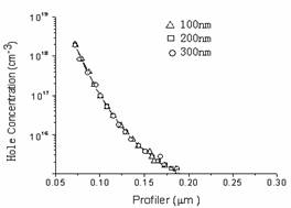 我們主要關(guān)心的還是表面附近載流子的濃度。圖5為樣品表面附近空穴濃度和激光輻照時間的關(guān)系。從圖中可以看到隨著輻照時間的增加,表面附近的空穴濃度也增加,這可能是由于輻照時間較長時Zn摻入的濃度較大的原因。樣品表面附近的空穴濃度都在3×1018cm-3以上,最大約為5.8×1018cm-3。當(dāng)然對于具有器件結(jié)構(gòu)的材料來說并不是輻照時間越長摻雜效果越好,除了考慮到樣品不允許破裂之外,還有一個重要的限制就是不能因摻雜的深度太深而破壞器件的結(jié)構(gòu)。為了應(yīng)用到光電器件的制備,對于激光參數(shù)需要很多的優(yōu)化選擇。