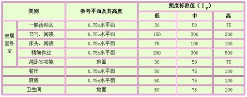 住宅室內(nèi)根據(jù)房間功能的不同,所要求的照度值也是有變化的,在做照明設(shè)計時,應(yīng)該注意這一點,不能一概而論。各 個功能房間的照度標(biāo)準(zhǔn)值如表1所示。