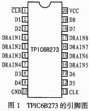 TPIC6B273采用20腳雙列直插式DIP封裝形式,其引腳排列如圖1所示。它的控制方式與74LS(HC)273的控制方式相同。