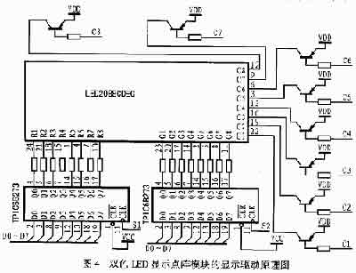 用于發(fā)布消息、顯示漢字的點(diǎn)陣式LED顯示屏通常由若干塊LED點(diǎn)陣顯示模塊組成;用于顯示漢字、圖形的8×8單色LED顯示點(diǎn)陣模塊,每塊有64個(gè)LED;而紅、綠雙色LED顯示點(diǎn)陣模塊有64個(gè)紅色LED和64個(gè)綠色LED。為了減少引腳且便于封裝,各種LED顯示點(diǎn)陣模塊都采用陣列形式排布,即在行列線的交點(diǎn)處接有顯示LED。因此,LED點(diǎn)陣顯示模塊的顯示驅(qū)動(dòng)只能采用動(dòng)態(tài)驅(qū)動(dòng)方式,每次最多只能點(diǎn)亮一行LED(共陽(yáng)形式LED顯示點(diǎn)陣模塊)或一列LED(共陰形式LED顯示點(diǎn)陣模塊)。由于TPIC6B273是以OC門(mén)方式輸出的,所以特別適宜選擇共陽(yáng)形式LED顯示點(diǎn)陣模塊做基礎(chǔ)顯示單元。圖3所示是一個(gè)單色 LED顯示模塊(單色8×8點(diǎn)陣)的顯示驅(qū)動(dòng)原理圖。圖中,由8?jìng)€(gè)晶體管為LED點(diǎn)陣顯示模塊(8行LED)提供行驅(qū)動(dòng)電流,TPIC6B273則用于控制一個(gè)單色LED顯示模塊的列方向顯示,微機(jī)通過(guò)總線操作控制來(lái)完成對(duì)每一個(gè)LED點(diǎn)陣顯示模塊內(nèi)每個(gè)LED顯示點(diǎn)的亮、暗控制操作。以此類推,可實(shí)現(xiàn)整屏LED點(diǎn)陣的亮、暗控制,從而實(shí)現(xiàn)LED顯示屏漢字或圖象的顯示控制操作。
