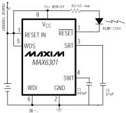 IC1可利用外部器件調(diào)節(jié)復(fù)位門限、復(fù)位時(shí)間及看門狗周期,它還提供一個(gè)由管腳設(shè)定的500倍乘功能,使看門狗周期增加500倍,借助于小電容產(chǎn)生長(zhǎng)延時(shí)。圖示聯(lián)接表示當(dāng)復(fù)位門限設(shè)置為最低值(1.22V),電池能量基本耗盡時(shí),LED將持續(xù)點(diǎn)亮。