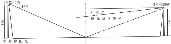 路燈的安裝仰角也是影響眩光指標(biāo)的一個(gè)重要因素。CIE規(guī)定路燈的仰角不能大于5,其主要目的就是限制眩光。我國(guó)有關(guān)規(guī)定路燈的安裝仰角在15以內(nèi),主要是受經(jīng)濟(jì)條件制約,為了降低燈高,節(jié)省造價(jià),當(dāng)在寬闊路面布燈時(shí),許多建設(shè)單位為了增加燈具的橫向照射距離,往往不是增加燈桿高度,而是隨意增加燈具的仰角,造成不必要的眩光污染。實(shí)驗(yàn)表明,增加仰角對(duì)路面亮度并無(wú)質(zhì)的增長(zhǎng)。而增加燈高、增大單燈功率并加大燈間距,即可保證照度及均勻度,又可減小仰角,限制眩光,同時(shí)由于用燈數(shù)量減少,造價(jià)并不增加。