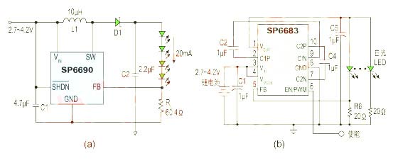 圖1:(a) SP6690的背光應(yīng)用電路圖;(b) SP6683的背光應(yīng)用電路圖。