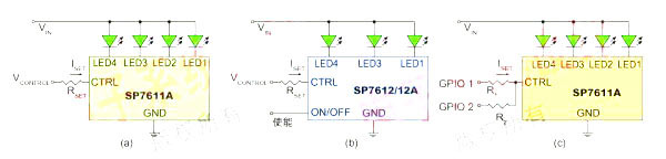 圖2:(a) SP7611A的背光應(yīng)用電路圖;(b) SP7612/12A的背光應(yīng)用電路圖;(c) 通過兩個GPIO端口和兩個電阻調(diào)節(jié)背光亮度的示意圖。