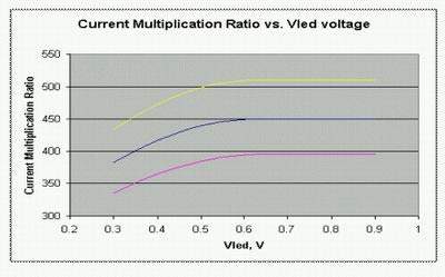 圖3:LED電流的放大倍數(shù)跟LED的導(dǎo)通壓降的關(guān)系曲線圖。