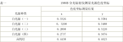(3)用美國(guó)光學(xué)研究公司 1980B 光譜輻射儀對(duì)鹵鎢燈及四種白光源進(jìn)行標(biāo)定,測(cè)量光譜分布,計(jì)算出色度坐標(biāo)。數(shù)據(jù)見表一。