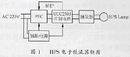 能夠?qū)崿F(xiàn)上述基本功能的方法有好多種,雖然許多廠商競(jìng)相研制生產(chǎn),但能做到實(shí)用較為困難,因?yàn)椋?jiǎn)單的電路難以滿足要求,復(fù)雜的電路成本昂貴。通過對(duì)HPSL電子鎮(zhèn)流器的大量研究,本文介紹采用美國(guó)UNITROD公司專門為HIDL控制器設(shè)計(jì)的專用芯片UCC2305[2]制作的250W鎮(zhèn)流器,其基本的框圖如圖1所示。
