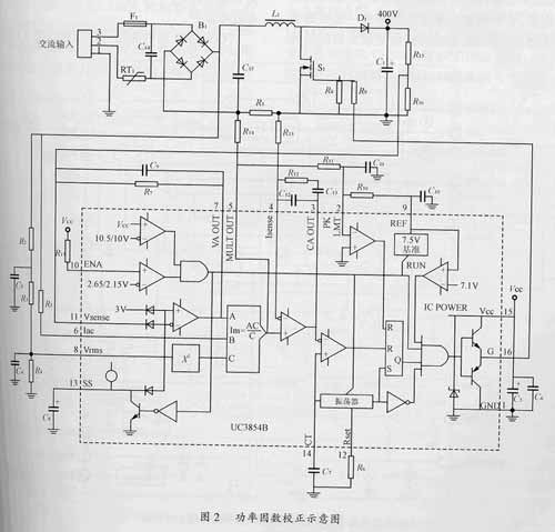 跟UC3854一樣,UC3854B提供了有源功率因數(shù)校正的全部功能,這些功能包括電壓放大器、模擬乘法/除法器、電流放大器和固定頻率PWM,另外,還含有功率MOSFET柵極驅(qū)動(dòng)器、7.5V基準(zhǔn)電壓、總線預(yù)測(cè)器、加載賦能比較器、低電壓檢測(cè)器和過流比較器等。平均電流模式的控制使正弦化線電流穩(wěn)定、低失真而不象峰值電流控制需要斜率補(bǔ)償。