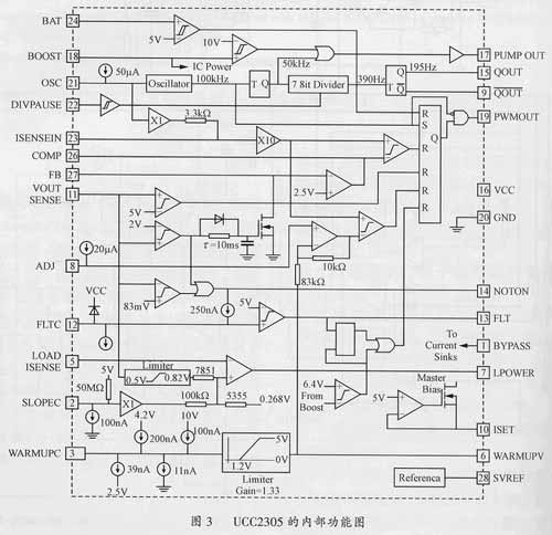 UCC2305的內(nèi)部結(jié)構(gòu)和功能如圖3所示。其單端驅(qū)動(dòng)腳19(PWMOUT)可驅(qū)動(dòng)正激式、反激式、升壓式、降壓式等不同類型的電路。主輸出腳9(QOUT)和腳15(QOUT)采用大電流推拉電路,可以驅(qū)動(dòng)半橋和全橋電路。橋路輸出采用低頻交流,UCC2305內(nèi)置分頻器將單端驅(qū)動(dòng)的頻率(一般取100kHz)除以512,得到195Hz的低頻,因此消除了聲共振。聲共振是HIDL在高頻電源供電時(shí)出現(xiàn)的放電電弧不穩(wěn)的現(xiàn)象,其機(jī)理是燈管內(nèi)壓力波的脈動(dòng)從管內(nèi)壁反射回來,如果與高頻電流的脈動(dòng)成分相位相同,則形成駐波,產(chǎn)生聲共振,輕則燈光抖動(dòng),重則燒毀燈管和鎮(zhèn)流器。