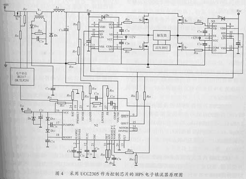 它主要由功率因數(shù)校正(PFC)電路、UCC2305控制電路、觸發(fā)電路和輔助電源4部分組成,電路較為簡(jiǎn)單。