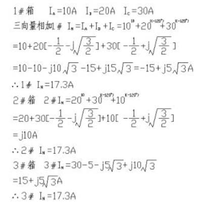 1#、2#、3#箱全用電時,1#箱到變壓器之間N線上電流為0,2#箱之間N線上有17.3A電流,#箱—2#箱之間N線上電流應為2#和3#箱的向量和,即: