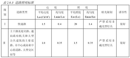 第2.0.3條 各級(jí)道路照明標(biāo)準(zhǔn)見表 2.0.3。